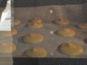 200℃のオーブンに入れ焼く。生地が完全に膨らんだところで温度を180℃に変更し、合計45分焼きます。