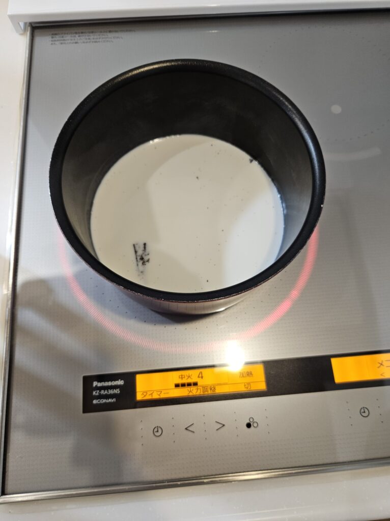 鍋に牛乳とバニラビーンズ(バニラオイルでもOK)を入れて沸騰直前まで加熱します。