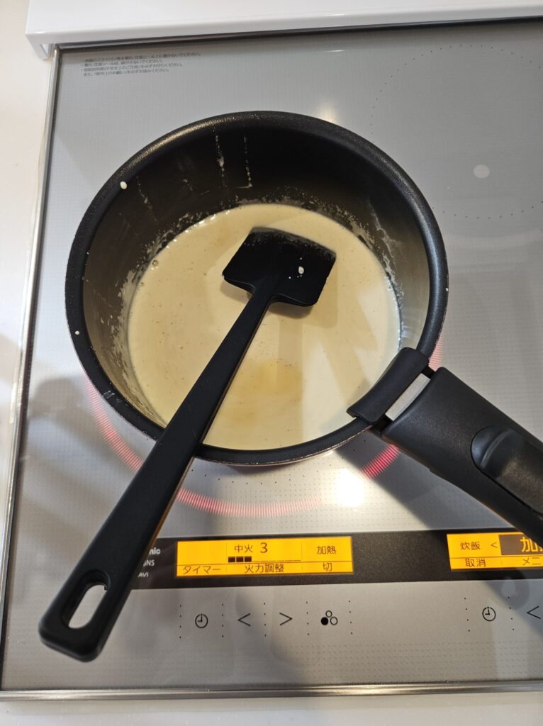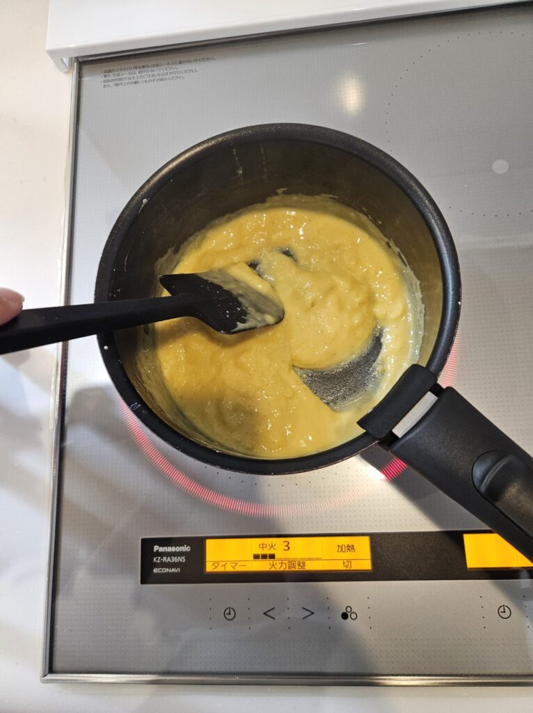 鍋を中火にかけ、ヘラで絶えずに混ぜながら加熱します。