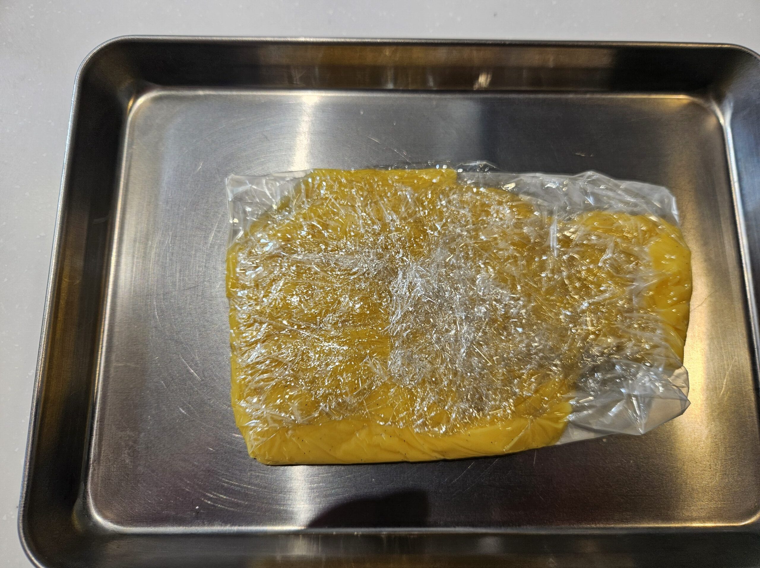 できたクリームはバットに移し、ラップを巻いて冷蔵庫で冷やします。