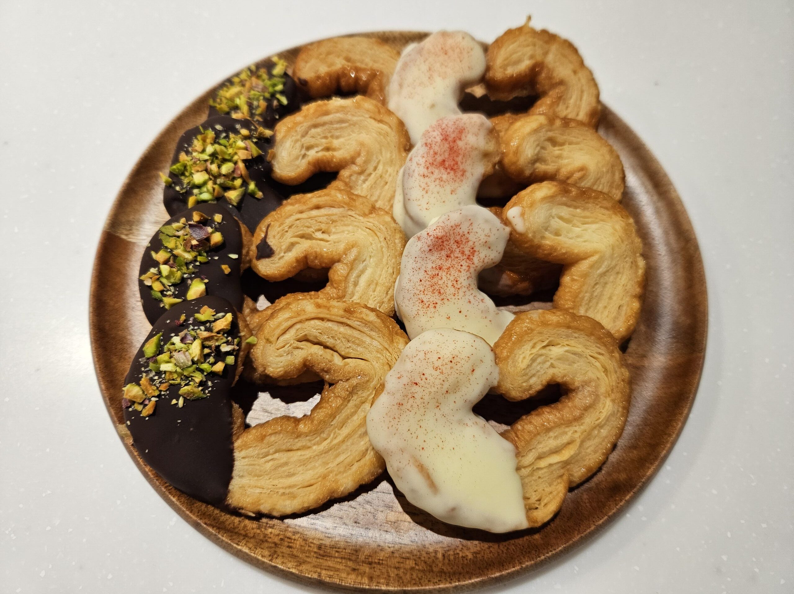 今回は、片側にチョコレートをディップし、イチゴパウダーとピスタチオで飾りました。