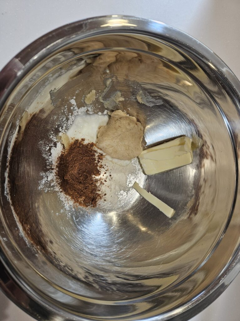 ボウルに前生地、本生地の材料をすべて入れ、30℃で30分休ませる。