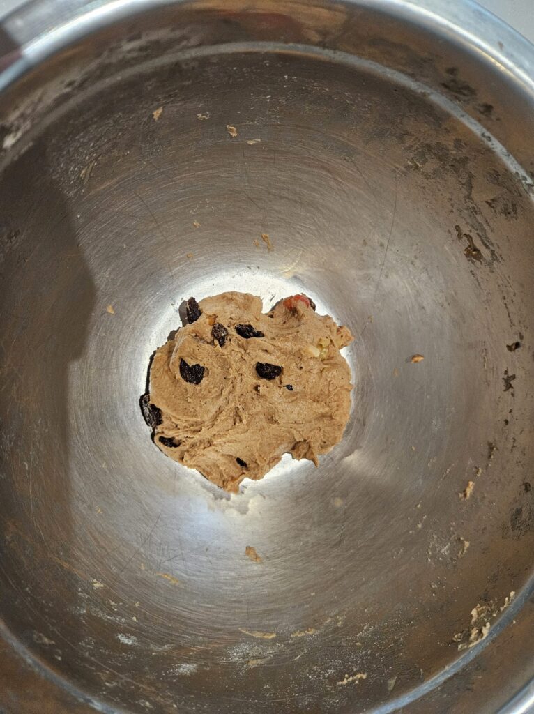 フルーツ漬けを加え。よく混ぜます。(今回はドライフルーツとラム酒)