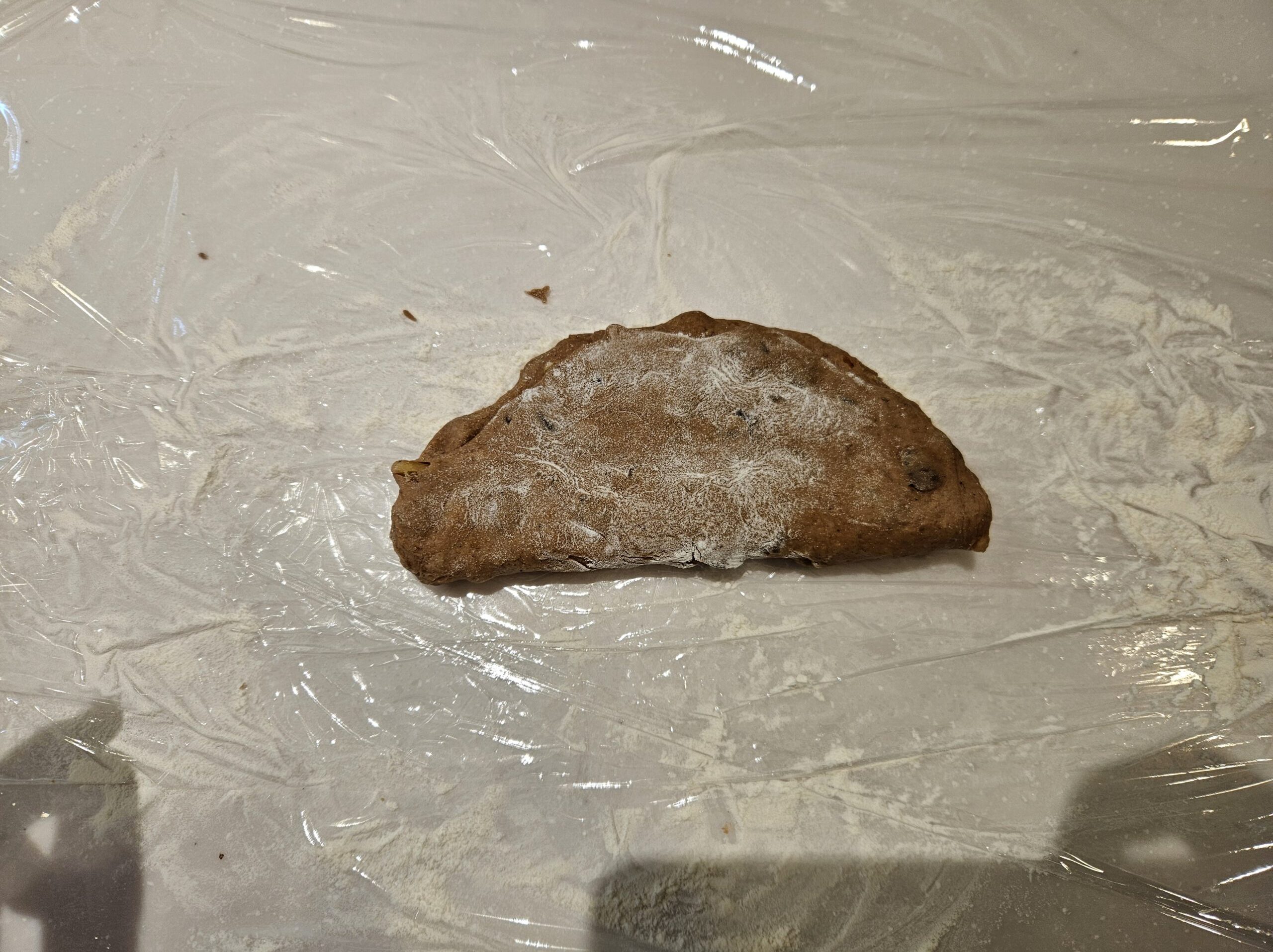 丸めた生地を押しつぶし、半分に折りたたみ、半月状にします。